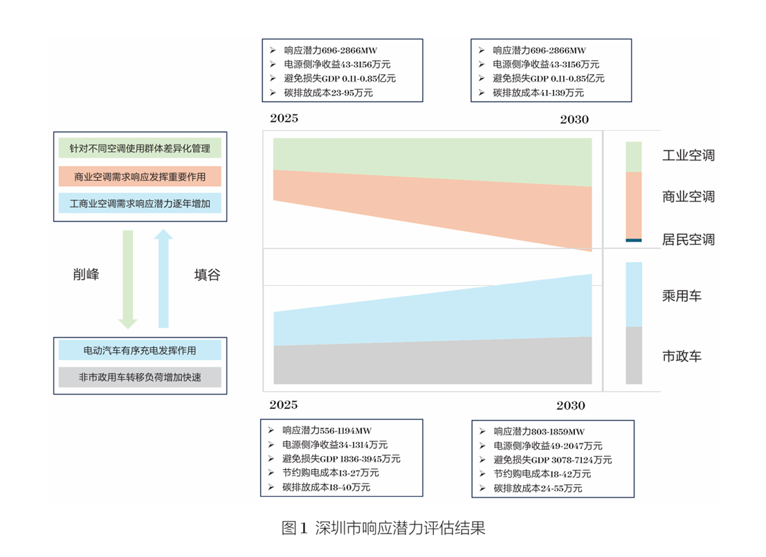 研究结果显示,在最佳情景下,2030年深圳市空调调节潜力可达 4844 兆瓦,相当于最高用电负荷的 16%;电动汽车调节潜力可达 1859 兆瓦,可填补低谷用电负荷的 10%。在经济性方面,空调响应可避免发电成本、减少碳排放和 GDP 损失;电动汽车响应除上述效益外,还体现于峰谷分时电价差带来的收益。假设 65% 居民户和 51% 工商业空调参与灵活性响应,单次响应可避免发电成本 1608–6438 万元,实现净经济效益 284–5114 万元,减少 GDP 损失 1.78 亿元;若 43% 电动汽车参与,单次响应可避免发电成本 644–2577 万元,实现净经济效益 114–2047 万元,减少 GDP 损失 0.71 亿元。