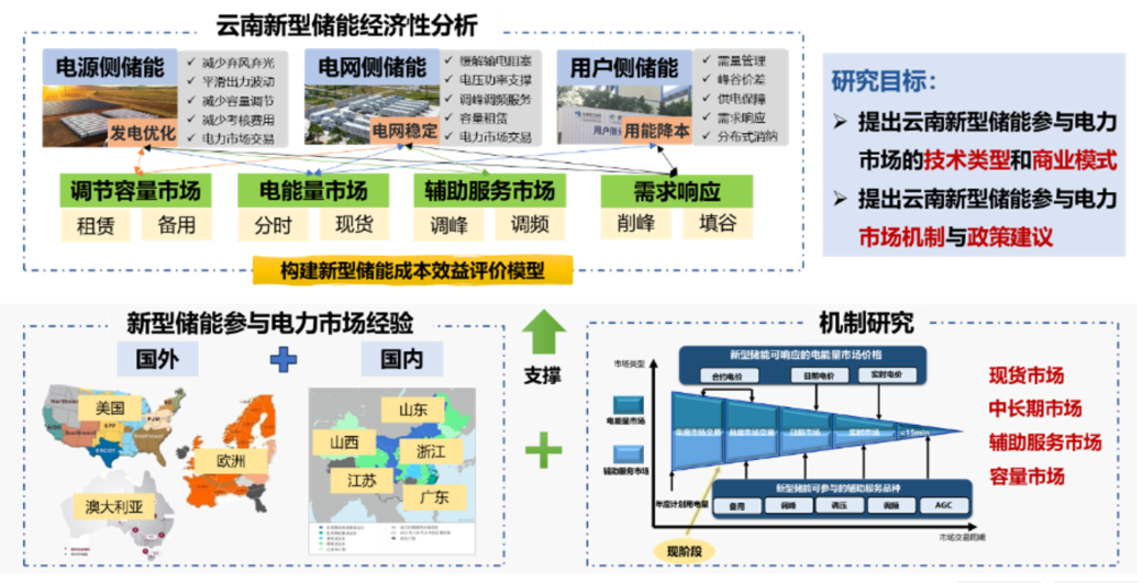 本课题紧扣云南高比例新能源渗透与高耗能产业发展的现实需求,系统构建了储能经济性分析与市场机制研究框架。研究从电源侧、电网侧、用户侧三个维度出发,匹配电能、调节容量、辅助服务和需求响应四类市场,形成了较为完整的储能市场研究体系。