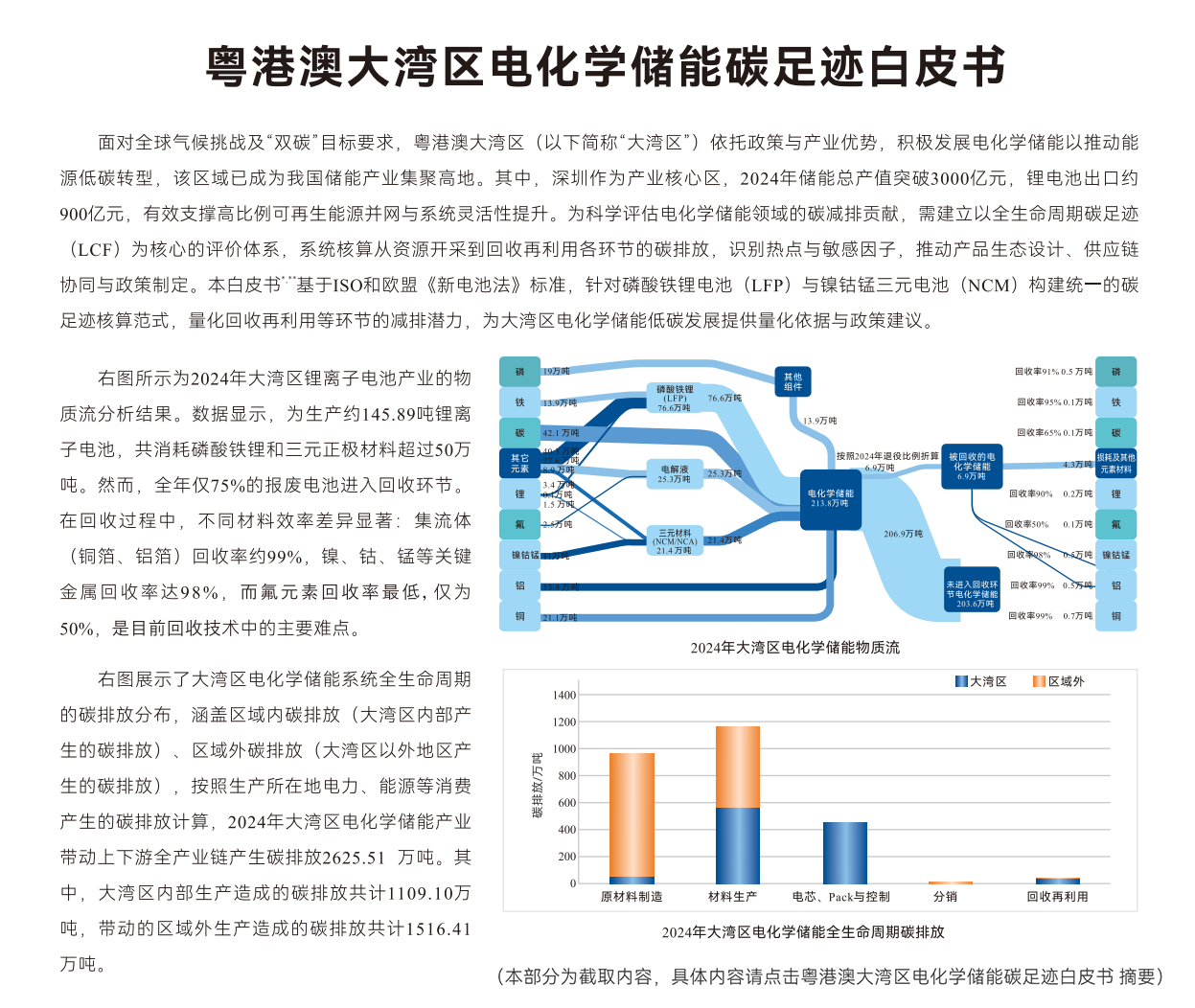本白皮书“以ISO14040/14044为方法学框架,参考欧盟《新电池法》 (EU 2023/1542),选取1千瓦时电池容量为功能单位,覆盖原材料制造与预处理、材料生产、电芯/Pack组装、电池分销及回收再利用等阶段,并结合大湾区电力结构中的隐含碳排放因子开展核算。研究对象涵盖磷酸铁锂(LFP)电池与镍钴锰酸锂(NCM)电池两类主流体系,并关注梯次利用与回收的减排潜力。通过建立统一口径的数据获取与处理流程,本白皮书旨在形成面向大湾区企业与园区的可复用核算范式与对标体系,为产品设计优化、供应链绿色转型与区域政策制定提供定量依据。基于相关发现,本白皮书针对原材料制造、材料生产、电芯/Pack与控制设备制造、应用与运行、回收与再利用阶段及跨阶段的支撑性政策与治理机制提出了相应政策建议,以期推动大湾区电化学储能进一步低碳发展。